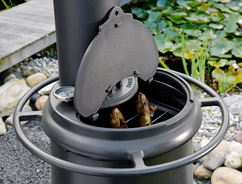 Das Räucherofenset besteht aus dem Guss-Aufsatz, dem Schornstein, dem Themometer und den passenden Räucherstangen. Aufgesetzt auf das Basisset des TROLL wird aus dem Gartengrill im Handumdrehen ein kleiner Räucherofen mit dem sich herrlich aromatische Spezialitäten zaubern lassen.