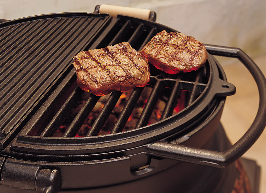 Das Wende-Grillrostsegment aus Guss hat zwei Seiten: ein glattes Rost für mageres Grillgut und eine Seite mit Auffangrillen für fettes Fleisch. Ganz nach Ihrem Geschmack...